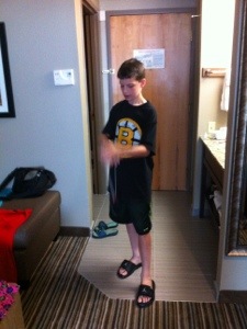 Hard to believe that Ben is already 11! We intentionally had a short driving day so we would have time for a variety of birthday activities. And pack it in we did. After breakfast at the hotel (yum, waffle maker!), we took a paddle boat onto the adjacent lake and Ben opened his presents on the water. Among them, he received 2 new yo-yos, which he was eager to try out. Then we all played mini-golf at the Lumberjack Village course and topped off the fun (but hot) game with ice cream – before lunch. 🙂