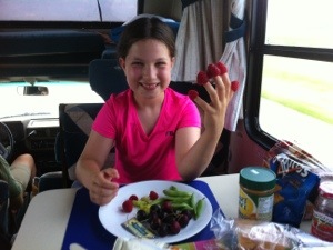 Today was a long driving day since we had to cross the whole width of Minnesota. Turns out that in addition to being the land of 10,000 lakes, MN is also a land of corn, as that was what we saw for most of our trip – perhaps that’s why Rowan was playing with her food during our driving lunch!