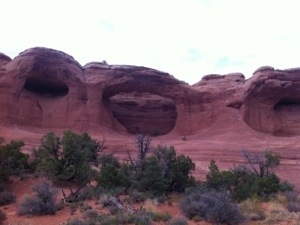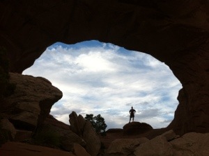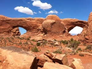We went for a walk in the Windows area (see the two arches that look like glasses, known as North and South Window), taking careful note of all the signs warning us to bring water. To say the weather was hot in Arches is an understatement; the sun beat down relentlessly on the exposed rock. The official high was 99 but the lack of shade made it feel well over 100. Suffice it to say we kept the hikes pretty short that afternoon.