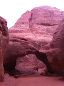 We stopped briefly in Moab for lunch (looking longingly at the many outdoor adventures they offer – we’ll have to return!) and then entered Arches National Park. Our campground was at the far end of the park so we rented an audio CD and took the driving tour. The arches are scattered like treasures throughout the park, some in clusters and others by themselves. A few can be seen from far off (and from the road) but others don’t appear until your hiking trail takes you around a corner after a few hundred feet or even a few miles.