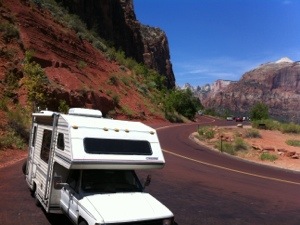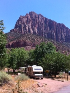 The short drive from Bryce to Zion was over by mid-day, in time for a picnic lunch in our campground. We really appreciated Chester’s extendable canopy under the relentless noon sun. But Chester had already done a yeoman job in getting us here, as the steep route into Zion involves some six hairpin turns and two tunnels, one over a mile long built by the good men of the CCC. They had to measure us before we went in to be sure Chester would fit.
