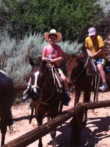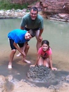 The afternoon’s first activity in honor of Rowan was an hour-long horseback ride along the Virgin River that runs through Zion Canyon. We followed this with a hike up the canyon to the aptly-named Narrows, where the 1000 foot sandstone walls approach within 20 feet of each other at some points. On our way back we paused to wade in the river and build a sandcastle.
