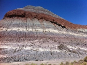 The next remains on our route were somewhat older: 180 million years, give or take. We took a detour from our path along I-40 to drive through the Petrified Forest National Park. Besides the petrified logs themselves, we also had scenic views of the Painted Desert, including the colored Teepee Mounds.