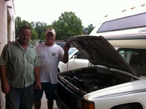 July 25 – We don’t like to share the minor tribulations of road travel on this blog but we lost our AC somewhere west of Amarillo. Traveling through the South in the summertime without AC is not recommended so we hoped to get it fixed if possible. Susannah called around and found a shop near our campsite who thought they could take us but by the time we arrived they were already full. One of the mechanics had a brother in Oklahoma City who had a radiator shop (this sounds like the plot to a bad novel, doesn’t it?) who could fix us up. And sure enough he did – turns out it was just a broken belt. While we dined on pizza buffet across the street he replaced the belt and checked the fluid levels and we were ready to roll.