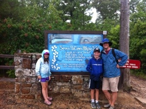 July 26 – After starting the day with Karen and Micah’s family (who had power at their house but still not at their temple), we continued east to Arkansas to Petit Jean State Park. Much of the infrastructure in this park, Arkansas’s first, is thanks to CCC efforts. Despite the rain, we decided to pursue the Seven Hollows Trail, a 4.5 mile loop through sandstone canyons and forested terrain. We paused under the Natural Bridge for a snack and a photo. Some of the rock formations on the trail are known as Turtle Rocks, but we were delighted to see a real turtle.