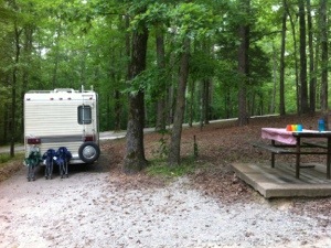 Our additional passenger safely inside, we continued on to our campground for the night at Chickasaw State Park. This should have been an easy jaunt from Memphis but we hit multiple snags on the way including searching several towns for a decent grocery store (pork rinds, anyone?), taking a wrong turn into the park (thanks, Google), then having to navigate several miles of gravel road in the wrong (and uninteresting) part of the park, and missing the main entrance due to poor signage. But we finally arrived at the campground that was quiet, clean, and blessed with horses in a nearby meadow for Rowan and hiking/running trails for Susannah. We had a tasty meal of Frito pie and salad for dinner with s’mores for dessert.