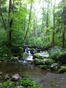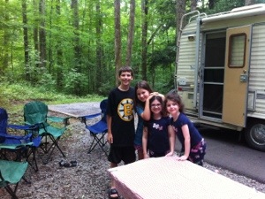 After a couple of stops for groceries, we rolled into our verdant, brookside campsite at Cosby campground in Great Smoky Mountains National Park and connected with our friends Matt and Hillary and their kids at an adjacent campsite. We dined on burgers and dogs (vegan style) at our blazing (and smoking!) campfire and rounded out the meal with more s’mores and wine (limited selection in eastern TN…)