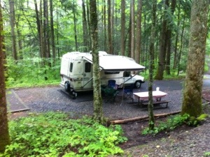 July 31 – We awoke at our campground to the patter of raindrops in the roof, but that didn’t stop Susannah from taking a short trail run/hike on the trail right across from our site. When she returned, all 9 of us huddled under Chester’s awning and had an al fresco breakfast. We were then tempted by the clearing skies to hike to an overlook on another nearby trail – see the kids on one of the log bridges along the trail and the view (still cloudy) from the top.