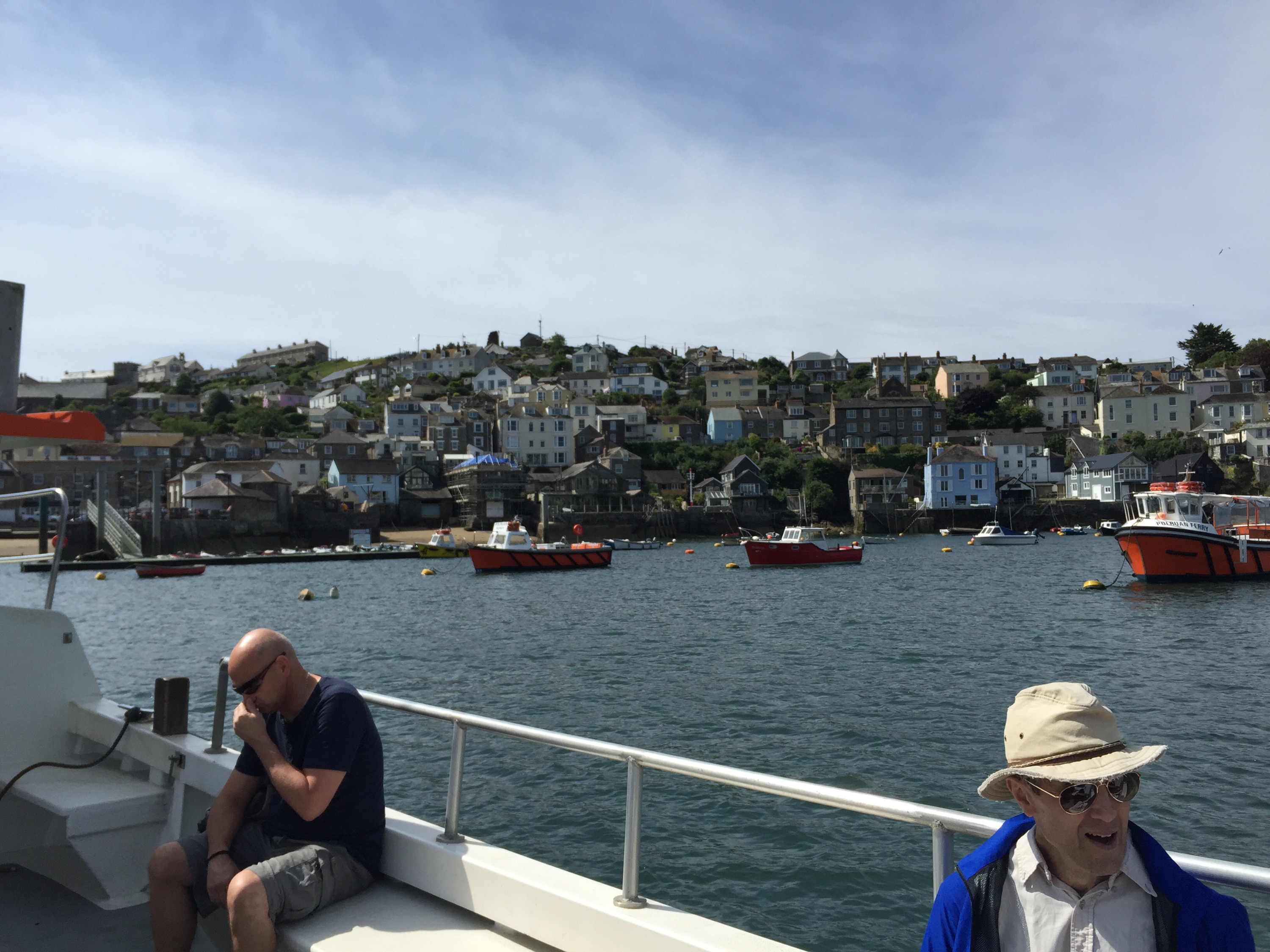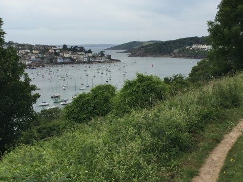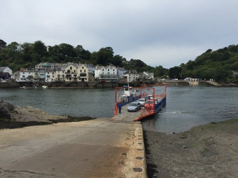 Today was our day to explore Fowey, which we did in smaller groups. Plans to go to Mevigassey were scuppered when predictions of rough seas shut down the ferry service for the day. Instead, all the adults hopped on the local ferry across the harbor to Polruan where several groups headed off in different directions. (The kids took the morning off, reading and drawing in the B&B.) Nick and Roger went off in search of the Essa Stone, which they found standing in a field surrounded by bemused sheep. Susannah tackled the Hall Walk, a 4-mile circular route that featured multiple views of Fowey and Polruan, a footbridge, and an upriver car ferry crossing. The British thoughtfully place benches by all scenic vistas, leading to the Pavlovian hiker’s response: see bench, expect view! Meanwhile, Lyn and Dianne poked around Polruan and Fowey before meeting the kids for lunch.