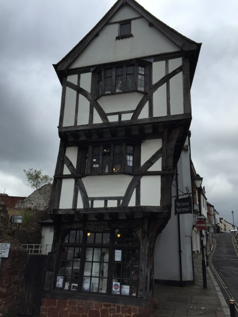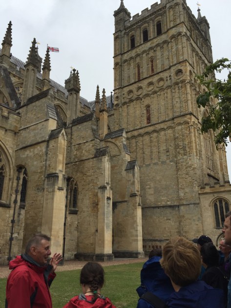 After lunch at a friendly crepe stand, we took a more traditional (“Red Coat”) walking tour above ground to learn more about medieval Exeter. Besides a number of fine half-timbered buildings and the famous Exeter Cathedral, we saw the excavated remains of the first stone bridge built in the area. It is contemporaneous with the original London bridge and was similarly garnished with shops and buildings when in use.