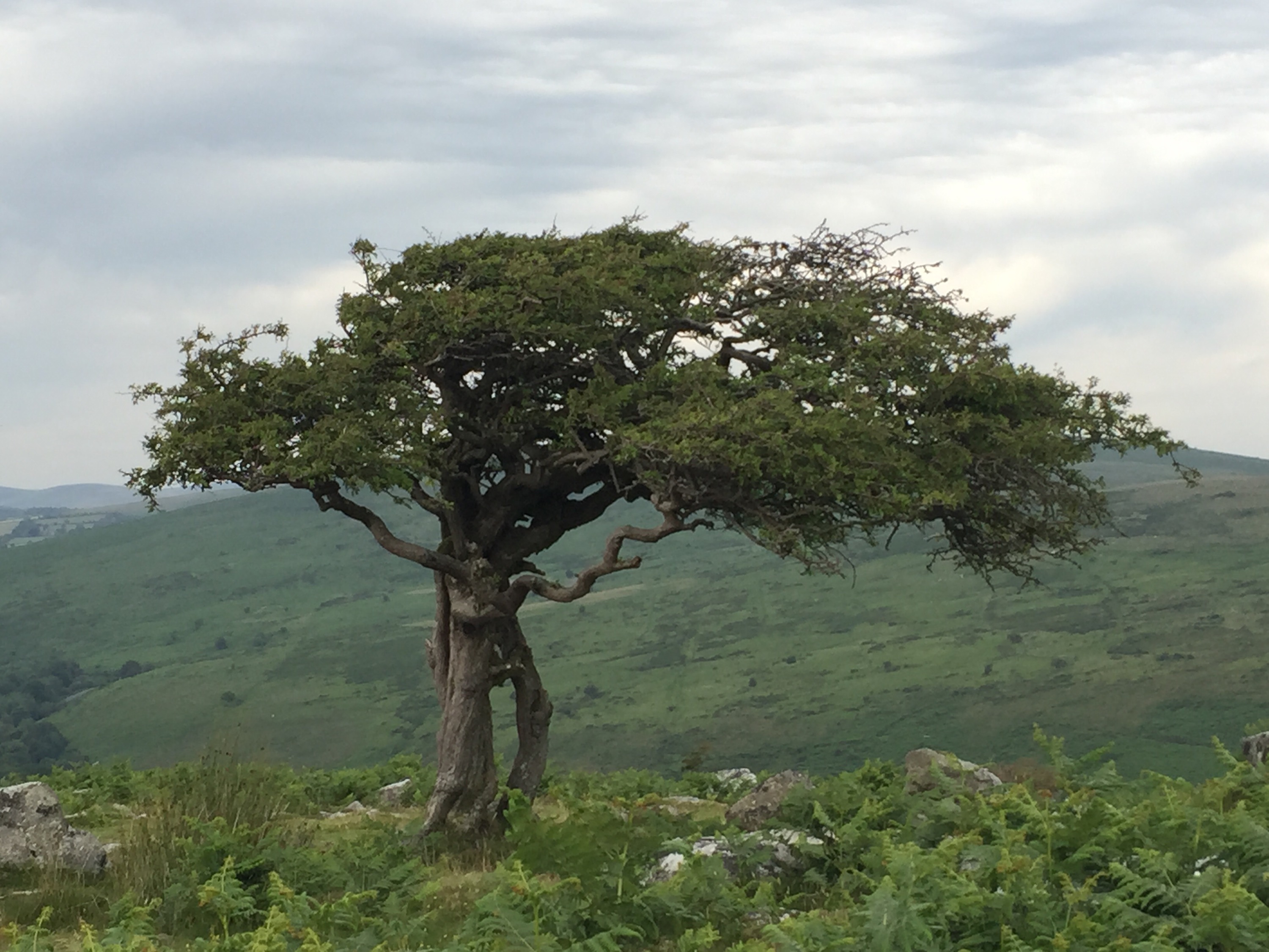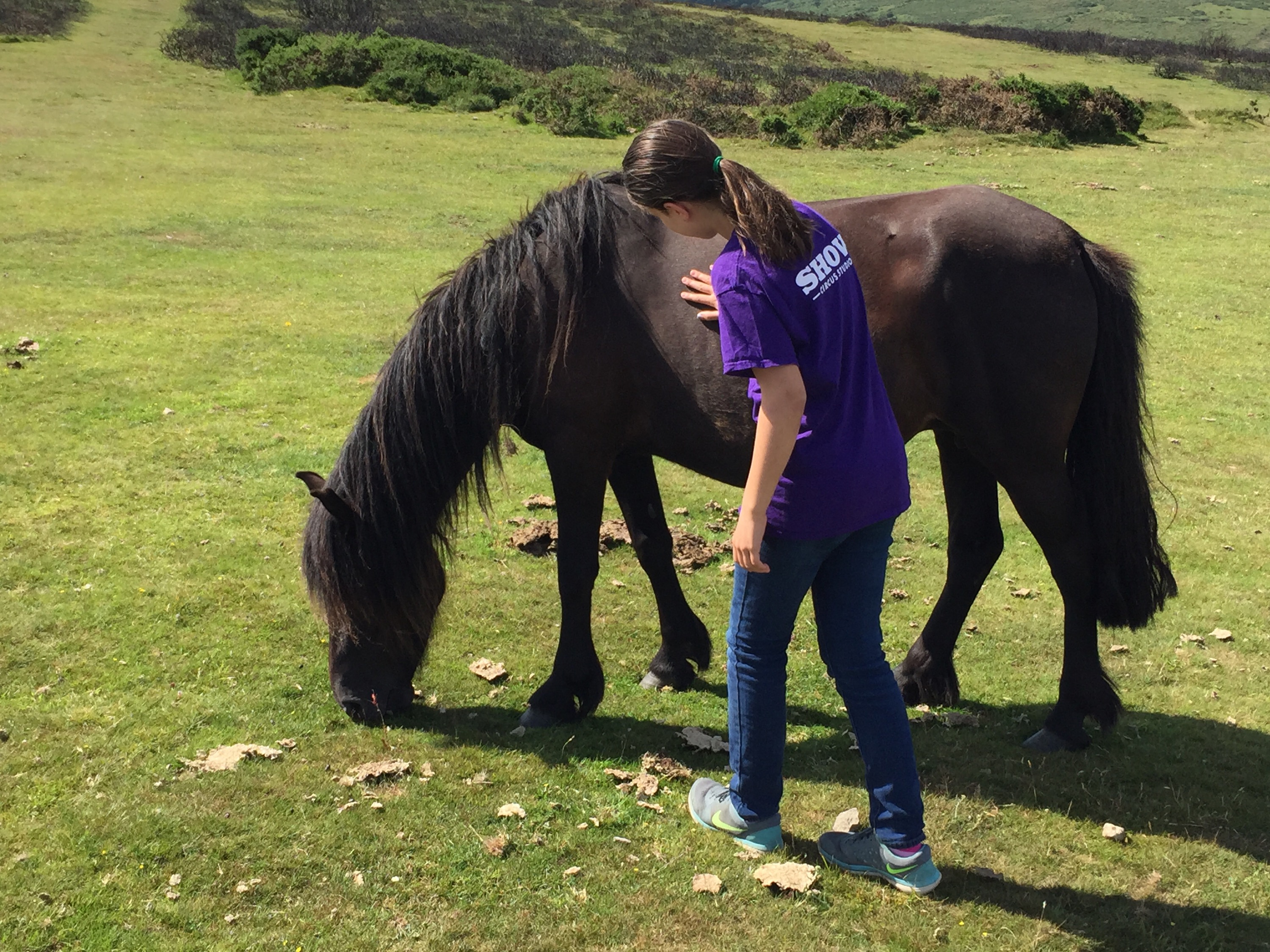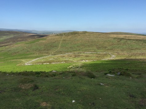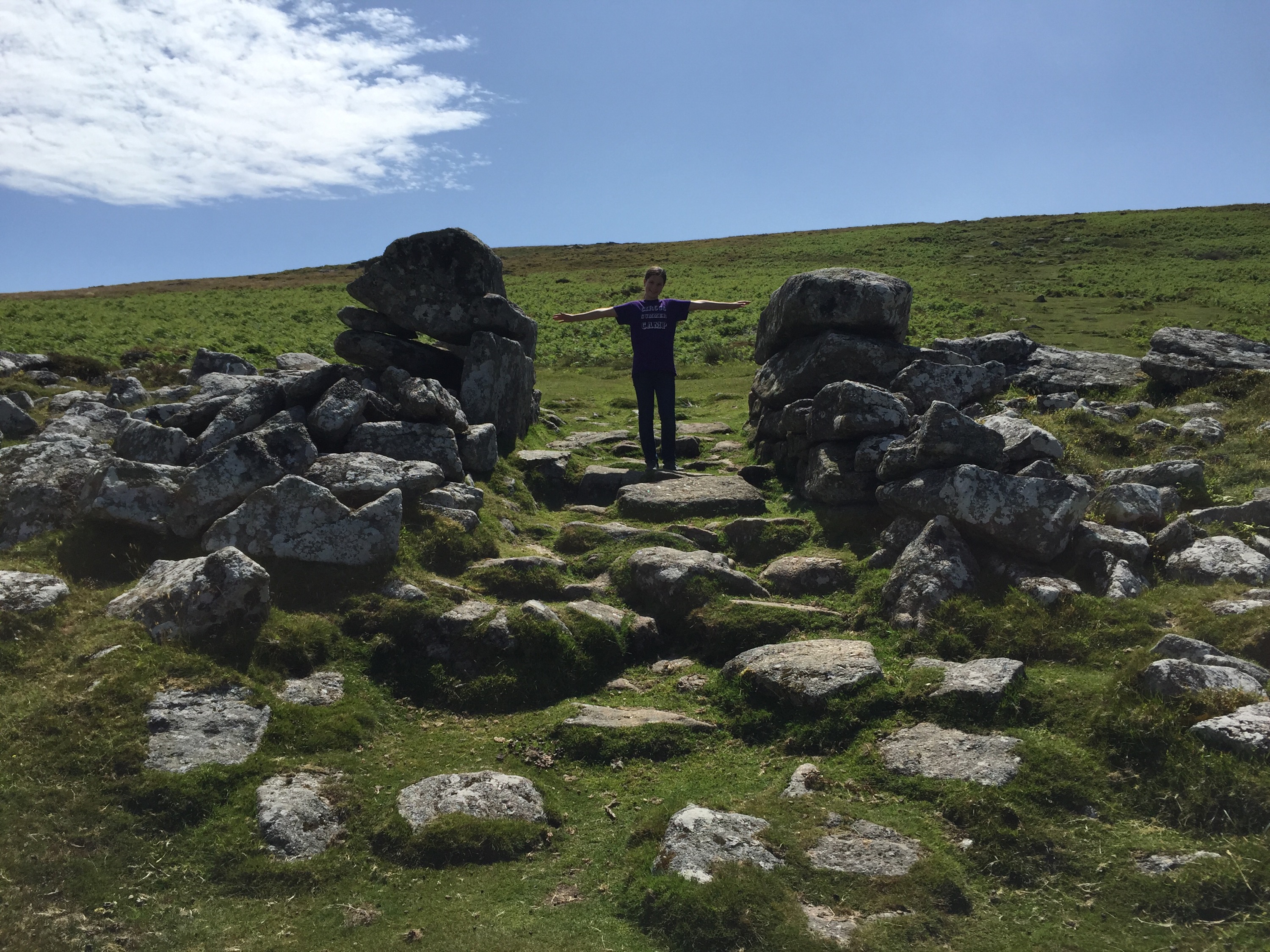 Dartmoor was settled in the Bronze Age and many remains are still visible across the landscape. Alex took us to Grimspound, a ring village with 24 house foundations. From it we hiked up a ridge to see one of three barrows at the top. On the way down we came across a group of hill ponies, more skittish than those we’d seen before.