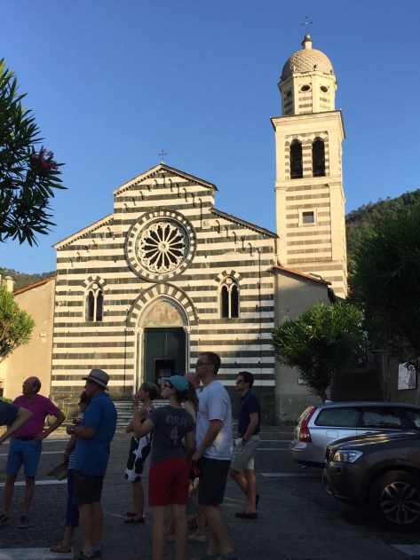 We all joined together in the evening (what the Italians would call afternoon) for a local history tour by a very enthusiastic and knowledgeable guide. It seems that Levanto was actually two villages in the old days separated by the small creek that formed the local harbor. There was quite a bit of local rivalry, with the Genovese paying for a fancy new church on one side and the local feudal lords favoring the other. The fierceness of the “marry local” sentiment is reflected today in the saying “wives and oxen from your own village”. These days the harbor has long ago filled in from natural siltation and the boundary between the two towns is now just a car park in front of the Loggia. In some of the older buildings you can see how much the ground level has risen by the nearly buried columns on either side of the arched openings, which you now have to stoop to enter.