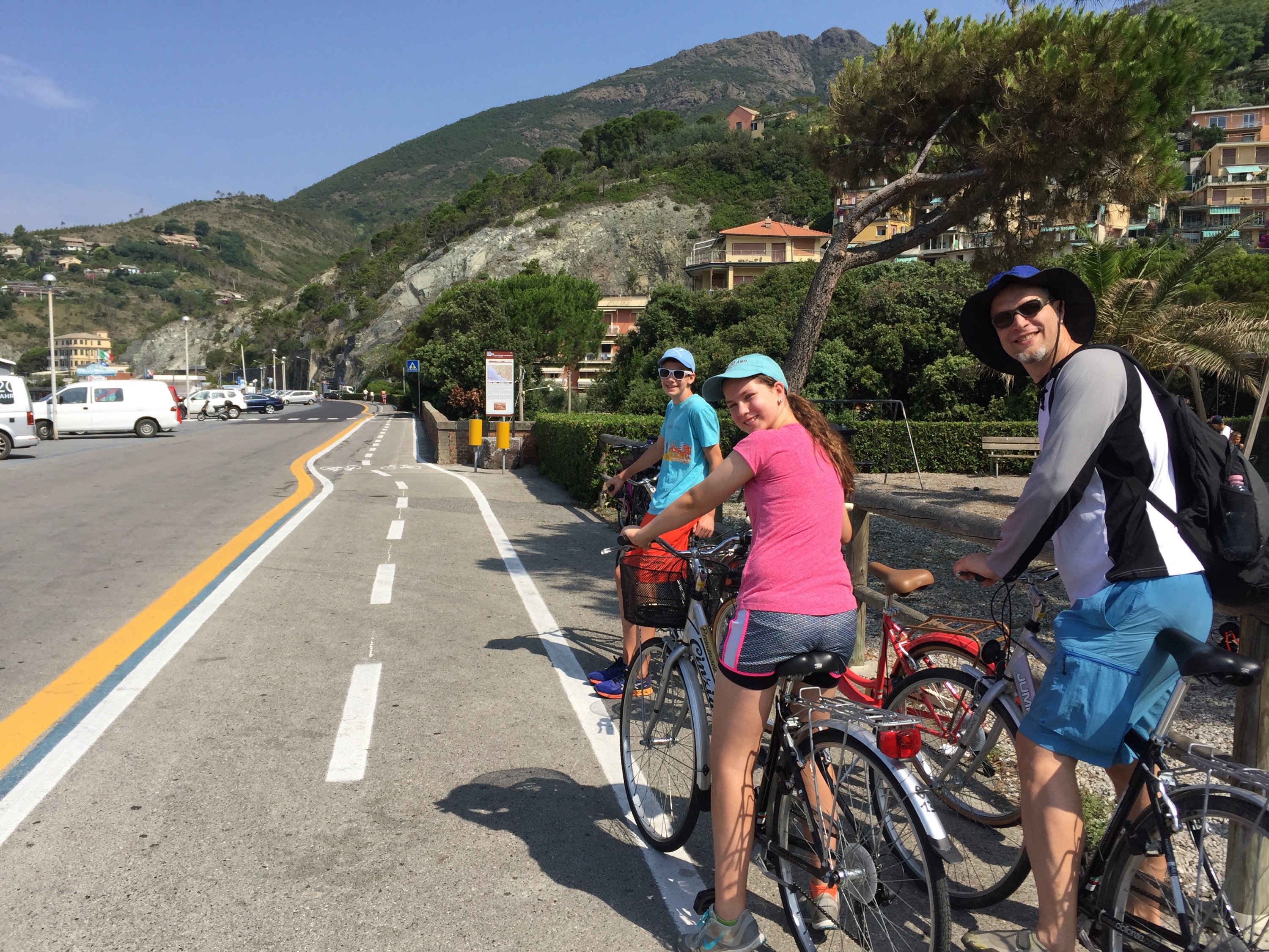 The coastline is very rugged here, but someone has taken the time to carve out not one but two rail lines that follow the Mediterranean shore. The larger one is still in use (in fact, we arrived on it yesterday) but a portion of the smaller one has been converted to a pedestrian/bicycle trail heading 4km up the coast from Levanto to Framura via Bonassola. Of course, we had to rent bicycles to explore.