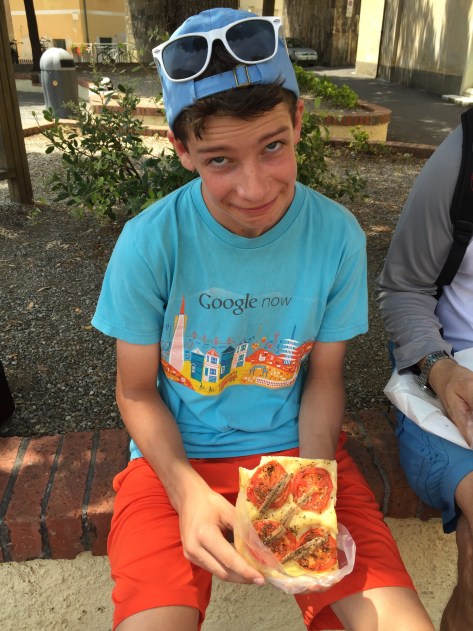 We lunched at a foccaceria in Bonassola (after the pre-lunch gelato, of course) where Ben had a sad focaccia moment, having ordered one with anchovies thinking they were some kind of sausage! Luckily, they had more pesto ones to fill the void.