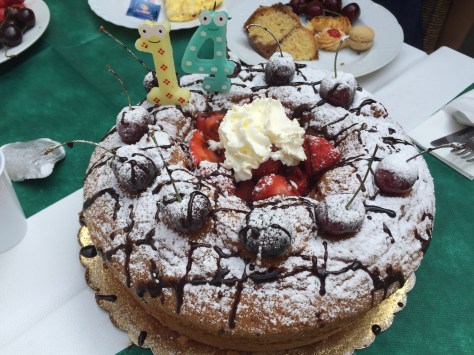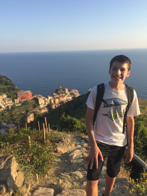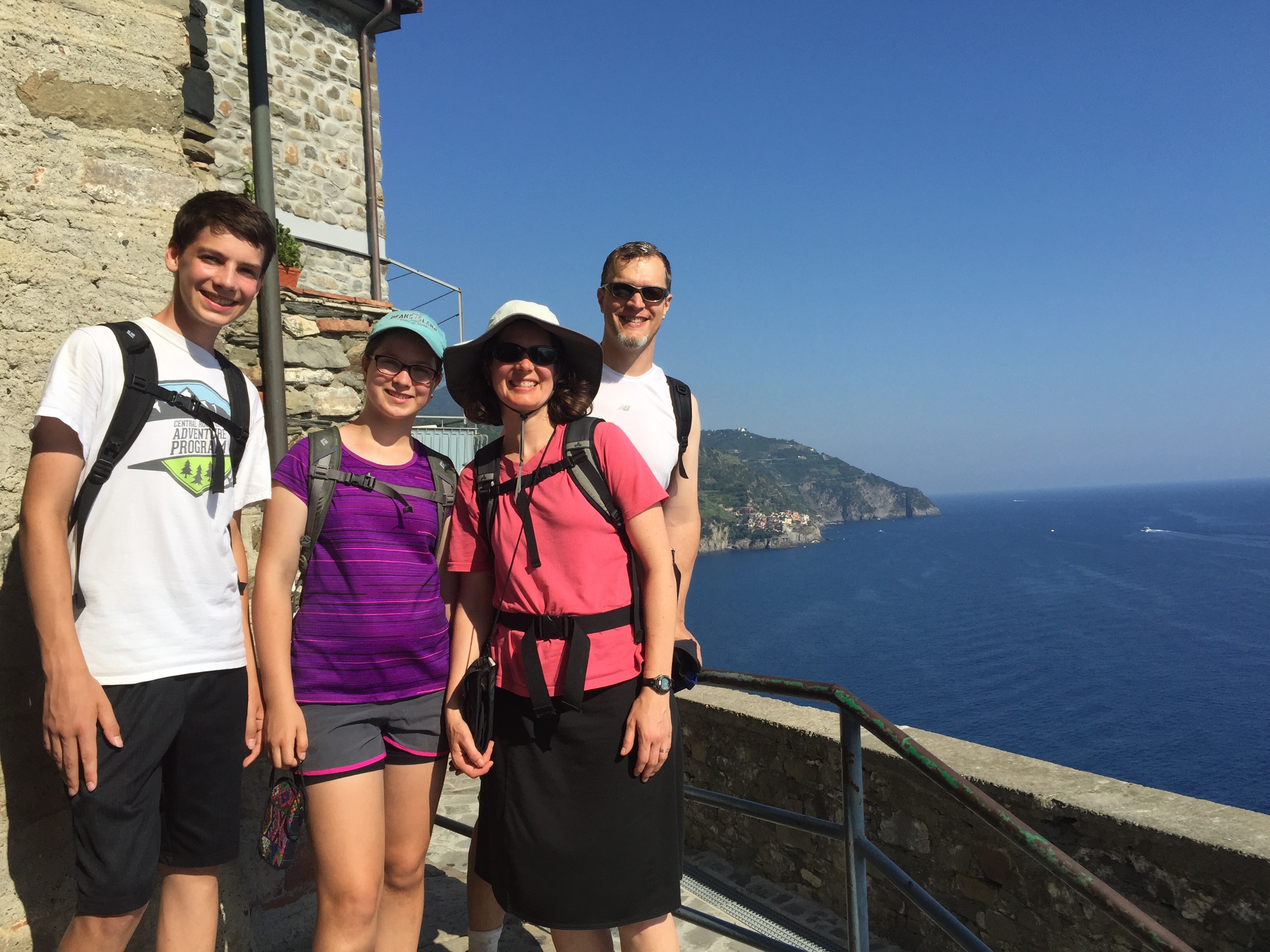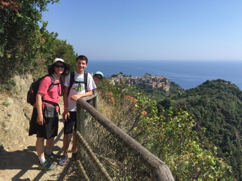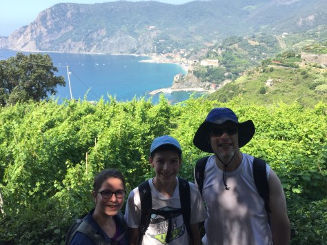 … and a birthday! Ben has celebrated his birthday in many different cities, but never so many in a single day. Today’s destination was Manarola, the fourth of five villages that constitute the Cinque Terre. That meant that our journey, which started in Monterosso, took us through Vernazza and Corniglia along the way. Each of the three legs of hiking was 2-2.5 hours, with pretty strenuous ups and downs (300-400 m of elevation change in both directions per leg) – we’re really proud of our kids! The upside of all this ascending and descending was the fabulous scenic views revealed around nearly every turn in the path. Photos can’t do it justice, but we’ve tried…