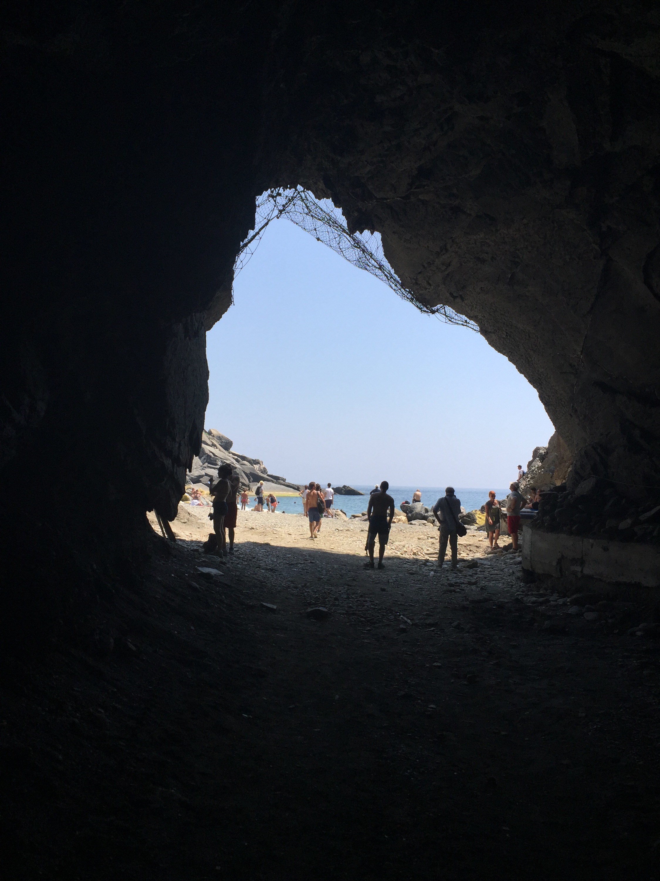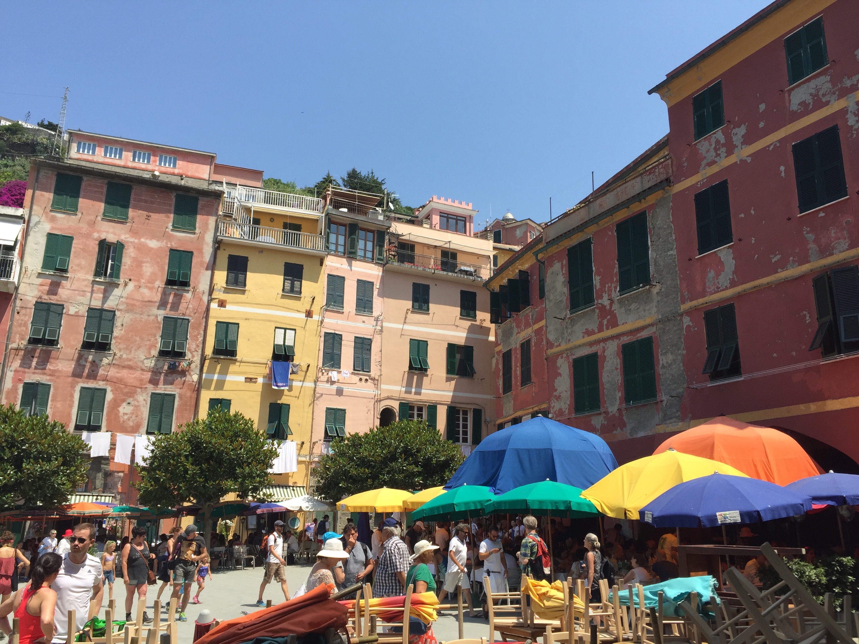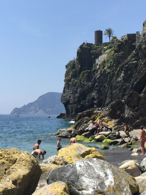 Vernazza too was packed with tourists but we discovered a secret passage under the rock leading to the locals beach where the kids had a chance to splash and collect rocks. Meanwhile, Susannah explored the tower on the hill, capturing a few more views from above. By this point our water bottles were already empty (it’s really hot in the Mediterranean in July!) but Nick cleverly stumbled upon the public water fountain in the middle of town so we could refill them all.