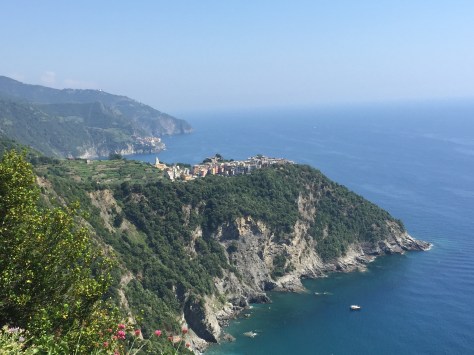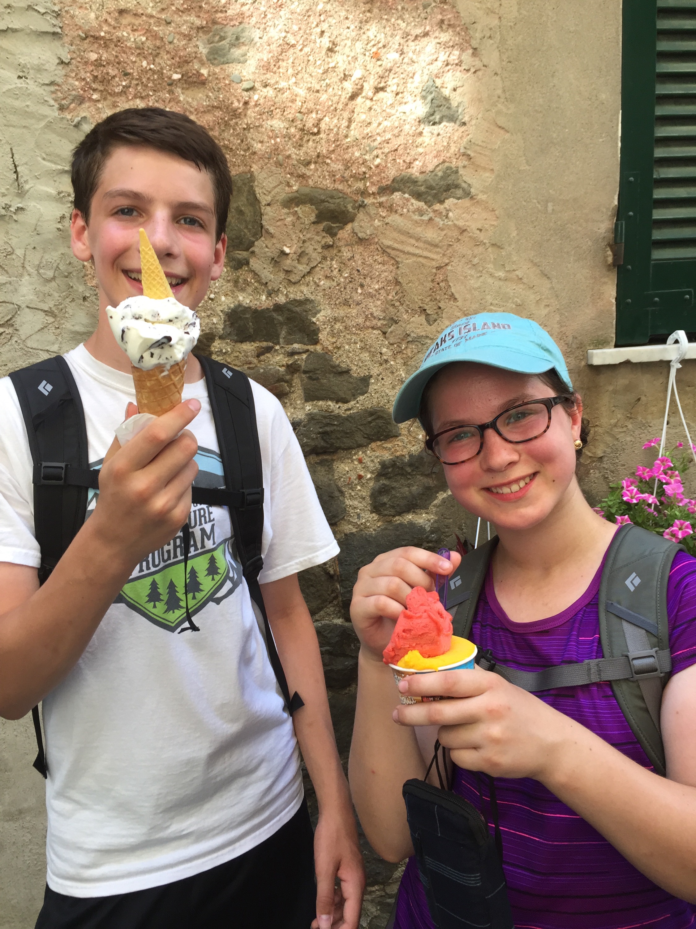 Corniglia is different from the other four, because it is perched on top of a rocky promontory rather than nestled in a valley close to the water. It’s a bit more isolated because the ferry doesn’t stop here and the railway station is 400 stair steps down. We appreciated the relative quiet as the kids ate gelato #2 in the square. The main street ends in a terrace with commanding views up and down the coast.