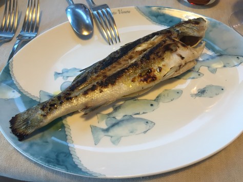 Before dinner we visited the San Pietro church situated on the rocky promontory at the tip of Porto Venere.  It, too, afforded fantastic views of the city, the gulf, and the Cinque Terre cliffs.  At dinner, we sampled local seafood – see the grilled fish that is truly just out of the ocean – then wandered around the harbor of Porto Venere, checking out the numerous yachts and vibrant nightlife.