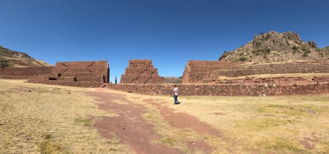 The Cusco area boasts archeological sites from periods throughout recorded history and today we sampled a wide range. The oldest spot in our morning tour was the city of Pikillacta, a Wari (pre-Incan) settlement dating from 1100 A.D. The stonework was primitive compared to later Incan standards but the scale and regularity of the urban layout were impressive. Unfortunately, the use of small stones and clay+straw mortar meant that the construction was not very earthquake-resistant, so the buildings were far from intact. Nevertheless we could still get a good sense of walled thoroughfares and building locations surrounded by a defensive wall originally 5m tall.