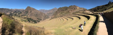 Shortly after, we got our first view of the Sacred Valley (so named by the Incas), a wide swath of fertile land along the Urubamba river that we’ll be exploring the next few days.One of the commonly visited towns in the valley is Pisac, in part because of its market in town, and in part because of its extensive Inca ruins just outside of town. We arrived at the market before the hordes of tourist buses, but we were not so lucky at the ruins. Luckily the latter are quite large and Juan knew how to find the less-trafficked areas. The archeological site boasts broad terraces and several complexes of buildings but the new thing for us was the cemetery located on an east-facing cliff face. Inca burials took place in holes carved into the rock. Unfortunately, Spanish treasure seekers looted them long ago.