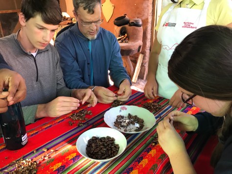 Following the museum visit, we travelled to Urubamba where we participated in several activities organized through Turismo Rural Comunito, a local women’s cooperative. After a home-cooked meal, we had a hands-on lesson on chocolate making. The outcome was delicious and we look forward to trying the process at home. (If you know of a good source in the U.S. for raw dried cocoa beans, please let us know.)