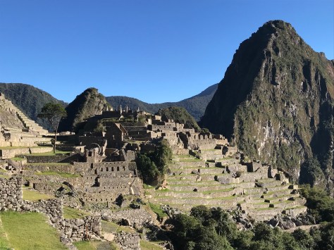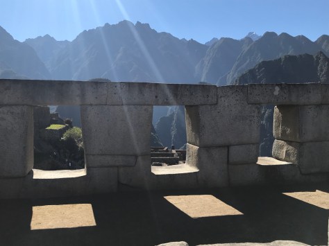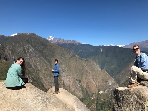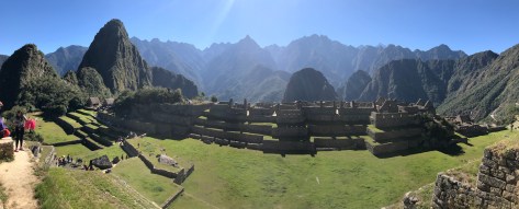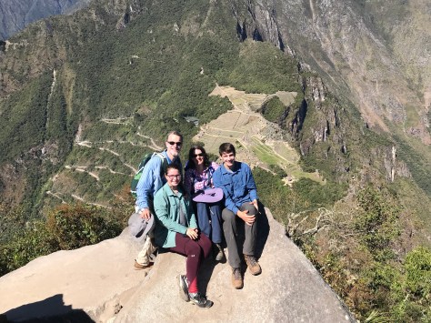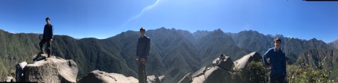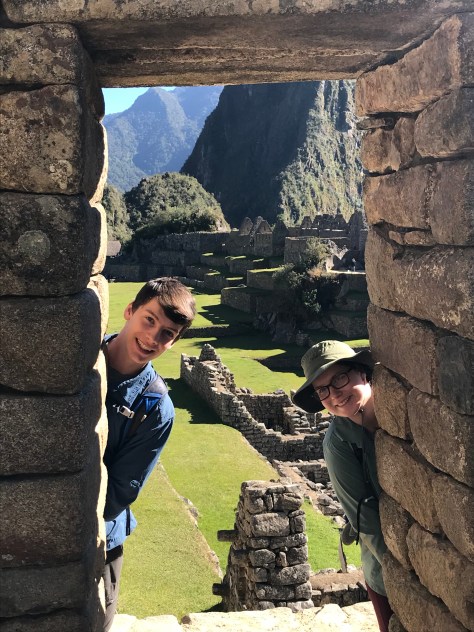 A highlight of the day was our hike up Wayna Picchu. This is a side trip requiring an extra ticket of which only 400 are issued per day due to the limited space on the steep trail. The hikers are released in two groups and partially by luck we were some of the first through the gate in our 10 AM cohort. Thanks to our time acclimating to the altitude and our “warm-up” hikes earlier in the the trip (remember the ones equivalent to hiking the Grand Canyon?!), we were faster to the top than other groups without really meaning to be. Well, Ben actually did want to be first to the top, and he was. 🙂 Rowan was next and the parents followed a bit later but we still had the peak to ourselves for close to 15 minutes, allowing us to take some family shots and creative panoramas.