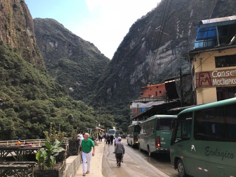 Unless you’re willing to shell out $1000 a night to stay at the hotel right at Machu Picchu, the only lodgings in the area are in Aguas Calientes, at the bottom of the gorge. AC is an odd town in a number of ways: flat land is in short supply, so unlike most settlements of its size, all the buildings are multistory. The only mechanized connection to the outside world is via the railroad, so the streets are pedestrian zones. There is a bus depot on the edge of town, but the buses only go one place. Some years ago, all the transportation services were Balkanized but they have since joined together under a single service that efficiently shuttles people up and down the mountain all day long (though that doesn’t mean you won’t spend an hour in line waiting for a bus at peak times). On the other hand, to walk the streets of AC at night is to suffer an endless series of solicitations from representatives of the restaurants that line the first floor frontages and given the isolation, bargains are hard to find.