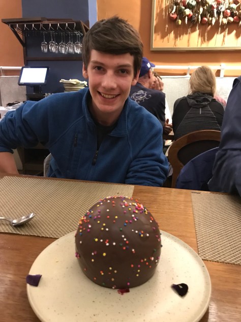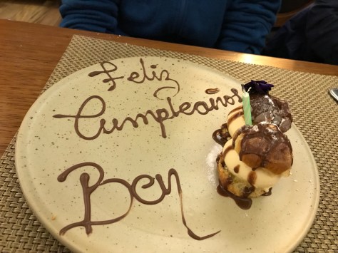 The return to Cusco took the rest of the afternoon but we had several more treats in store. The hotel Midori Cusco, where we had stayed before, treated us as old friends this time and gave us the best rooms in the house. After sharing presents with Ben, we made our way to a long-awaited dinner reservation at Chicha, which had been recommended to us on our culinary tour in Lima. The highlight of the dinner was the “miraculous bomb” dessert, a showstopping treat nearly the size of Ben’s head, made only slightly less impressive by the waiter’s repeated fumbles in attempting to serve it. After dramatically cracking the shell, he proceeded to spill the shards off the plate onto the table – not just once but twice while mumbling sorry. Apparently you need to be a professional to do these sorts of things! We ate it anyway and it was delicious. Happy birthday Ben!