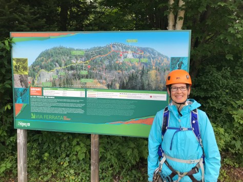 Our morning started early with a waffle and fruit breakfast at our B&B, followed by a taxi ride to the Mont Tremblant National Park. The activities in this area are spaced quite far apart so we are at a bit of a disadvantage having only bicycles. Fortunately, the local taxi service is only a (French) phone call away. Our destination was the Diable Registration Center where we met up with the guide for our via ferrata adventure. We were signed up for the intermediate length trip, which includes 800m of climbing (green and orange on the map below).
