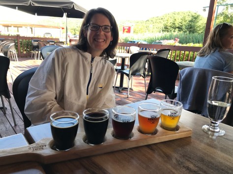 Aside from a few granola bars and protein sticks we hadn’t brought much food on the climb, so we were truly famished by the time we reached the valley floor again. Fortunately our friends at the Tremblant taxi service were happy to drop us at the local microbrewery for a hearty meal and other refreshments (beer or brownie sundaes, as appropriate). The Saint Arnould label even has a beer named after the P’Tit Train du Nord!