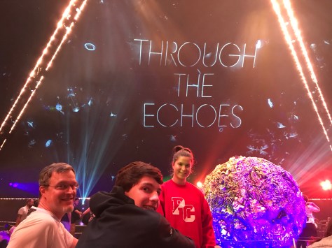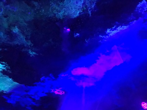 We all reconvened and headed downtown to Old Montreal, walking through streets and along stone piers at the waterside. After some free exploration (including a vegan milkshake for Susannah!!), we were headed for a rendezvous with an afternoon show. Held in a pyramidal tent erected on Clocktower Pier, this was a multimedia extravaganza conceived by one of the founders of Cirque de Soleil. The experience is somewhat hard to describe, but Nick suggests that if you imagine a fascinating hour-long medley of abstract screensavers set to pulsing New Age music and laser lights, you won’t be that far off. Or Susannah suggests Fantasia crossed with 80s German Disco set to Pink Floyd.