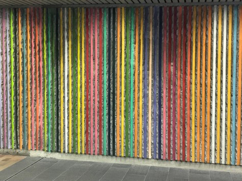 Montreal features quite a bit of public art and high-end graffiti. One bit that caught our eye was the bright color adorning what would otherwise have been a quite spartan Brutalist wall in the pedestrian tunnel Paris approaching the Champs des Mars station.