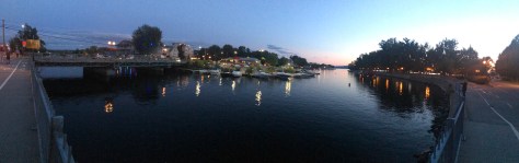 After a fruitful visit to the abbey gift shop, we drove to Magog where we had a quick dinner and short walk by the water to catch the end last rays of the setting sun. Lake Memphremagog stretches some 30 miles north to south straddling the US-Canadian border and is home to rumors of its own mythic serpent (named Memphre), perhaps a relative of the better-known Nessie in Scotland. We were quite taken by the beauty of the lake nestled under the surrounding mountains.