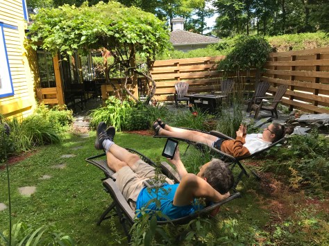 After breakfast, Ben and Susannah had a run/walk (respectively) at a local park that features a 2 km boardwalk over wetlands with views of Mont Orford in the background. Meanwhile, Nick and Rowan packed up the car and then had a little time to relax in the B&B garden.