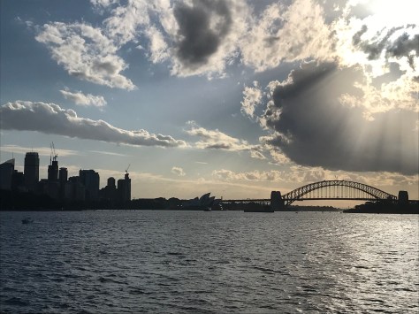 Our return trip by ferry to Sydney was at sunset and featured light and clouds mixing in the late afternoon sun. After a transfer at Circular Quay we took another ferry under the bridge to Pyrmont Bay.