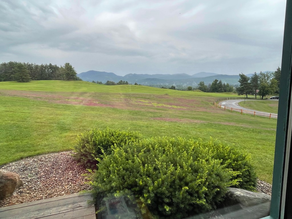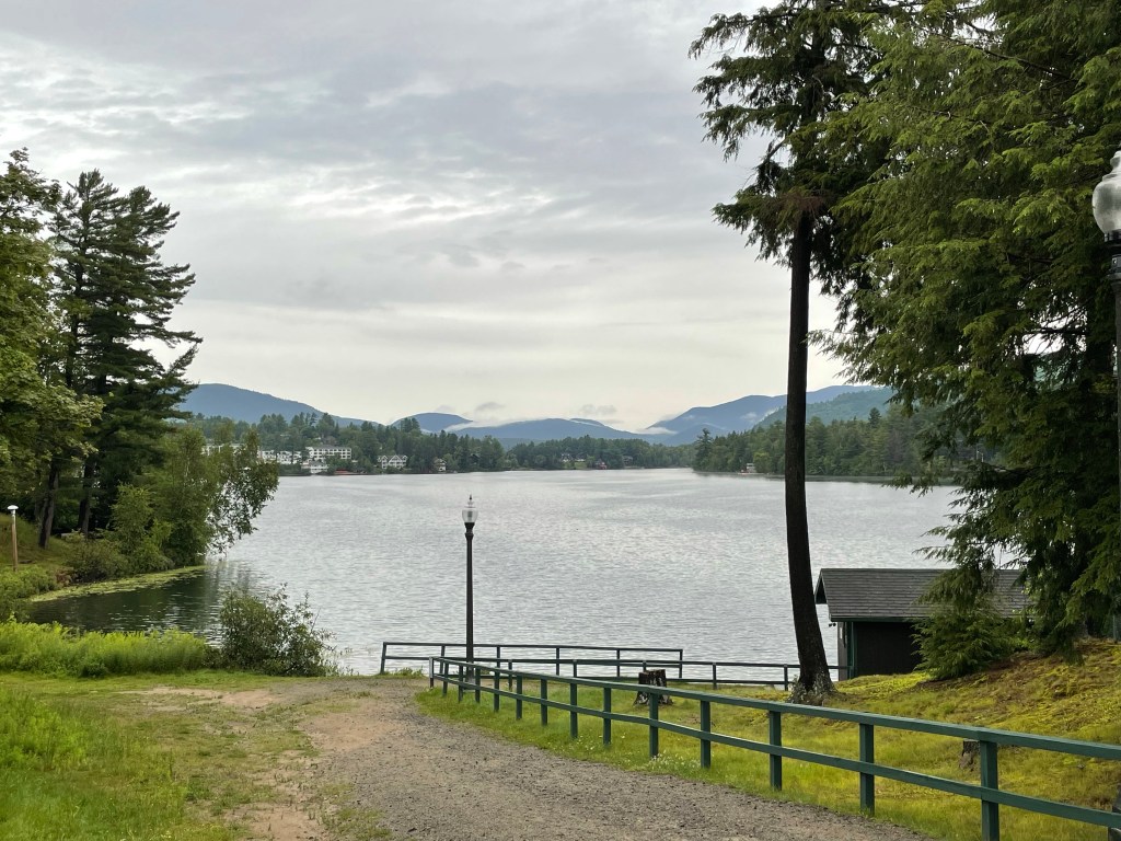 Lake Placid itself is a bustling village – between the tourists and the lacrosse tournament families here this week, one has to be savvy about dinner reservations, or risk waiting several hours for a table! While we waited for ours to be ready, we explored the downtown a little, making notes of places to return to on subsequent days. Every once in a while between the Main St shops we caught a glimpse of Mirror Lake, and from the park by the public bandshell, we could see the view in its entirety.