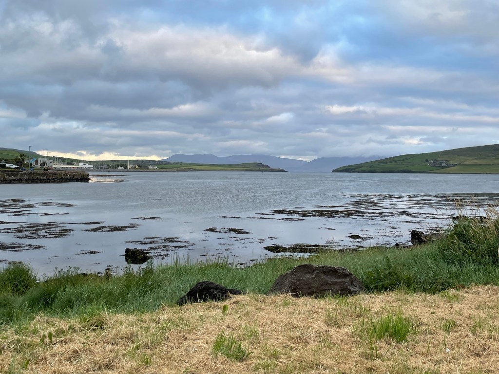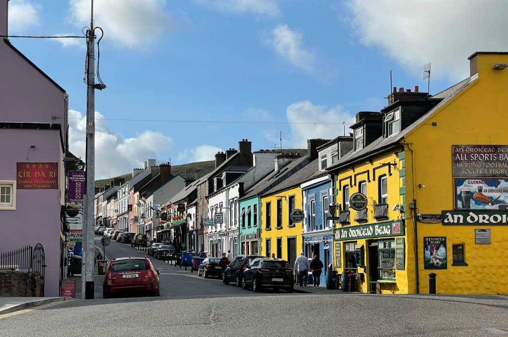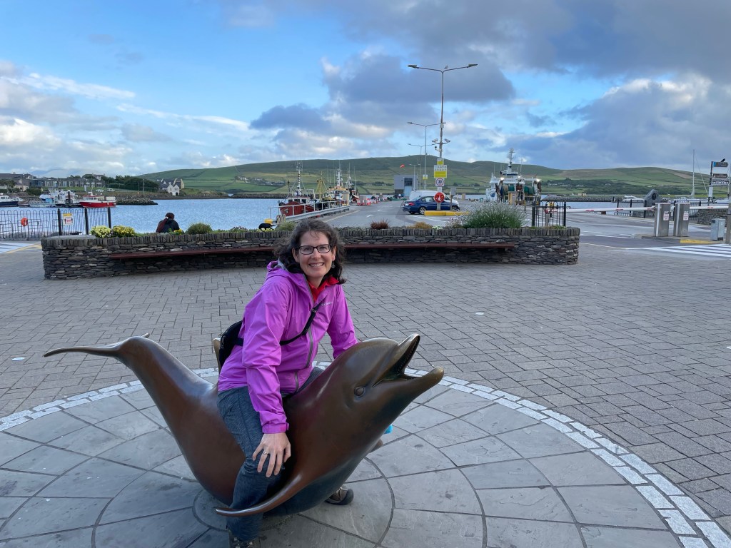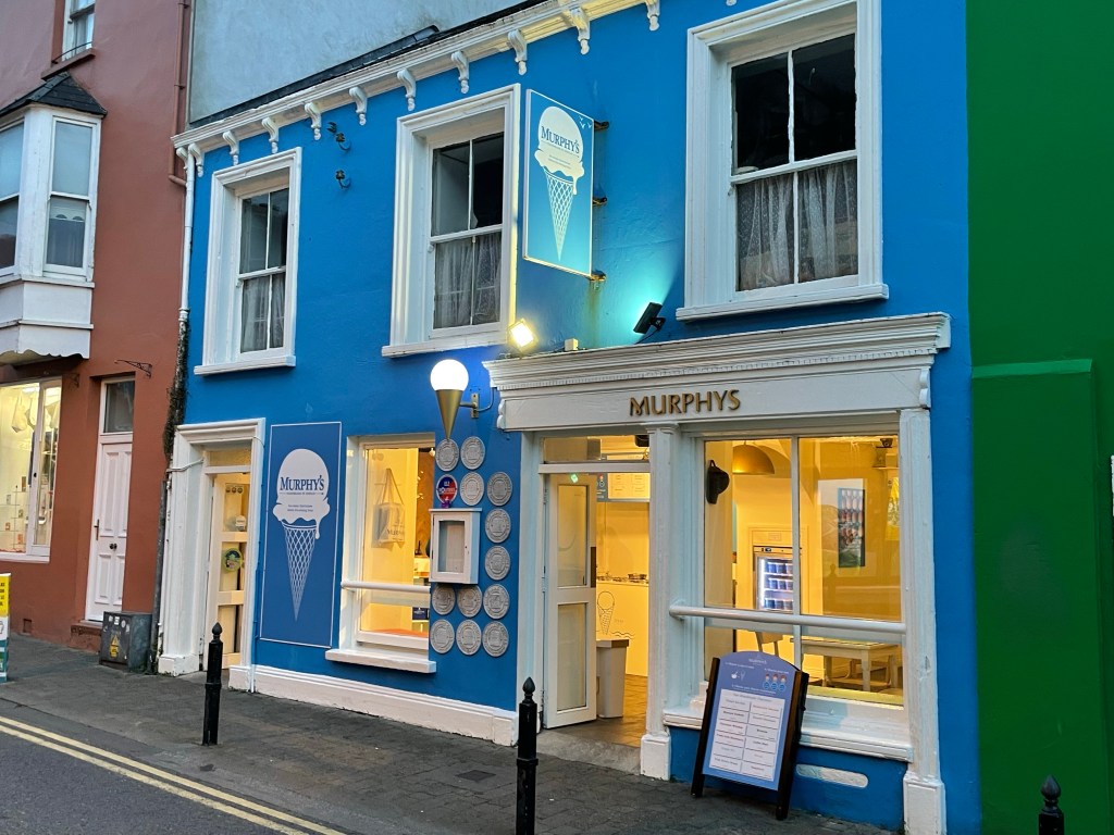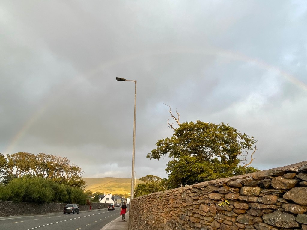 The dolphin statue that Susannah is sitting on commemorates a friendly dolphin that used to live in the harbor and greet the passing boats. We also include here a picture of an ice cream parlor with tempting and unusual flavors featuring local agricultural products. We tried the Irish Brown Bread, Chocolate Whiskey, and Dingle Gin. Delish! While exploring the town on foot, we happened to be in the right position to see the rays of the setting sun catch the local moisture in the clouds. They say that rainbows in Ireland can lead to Leprechaun’s gold – this one, fittingly, seemed to guide us to the ice cream shop!