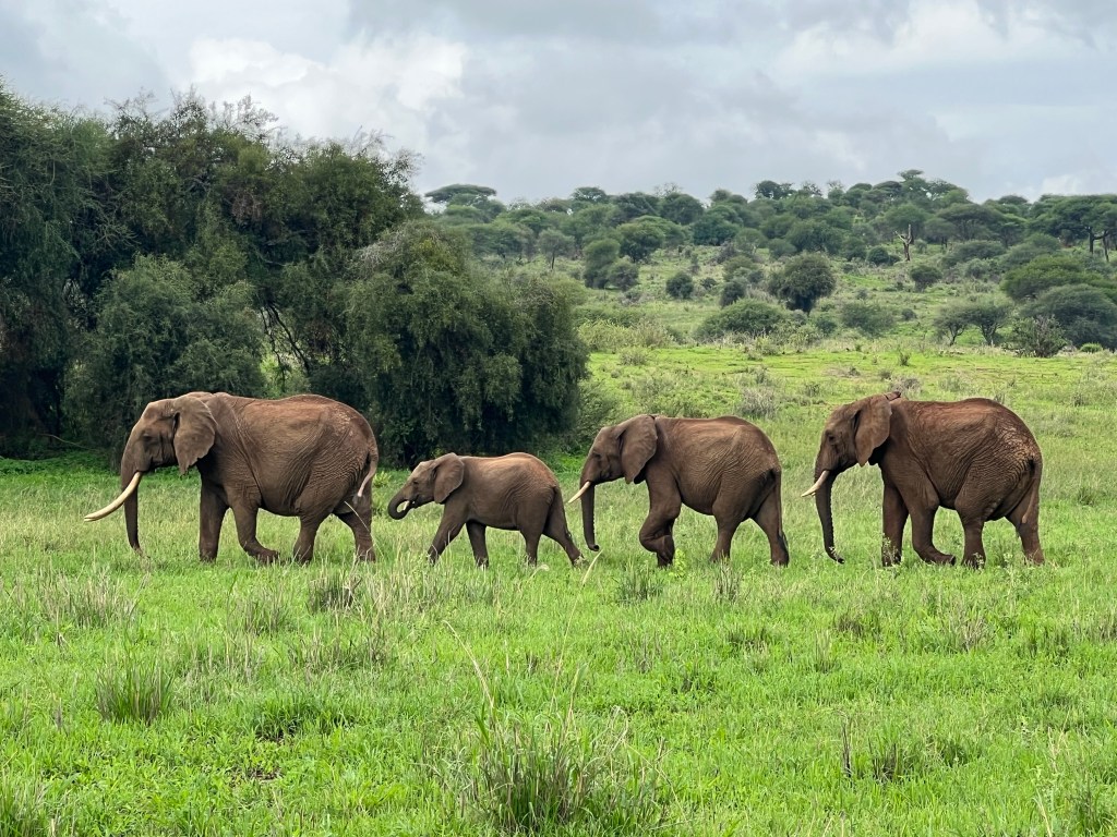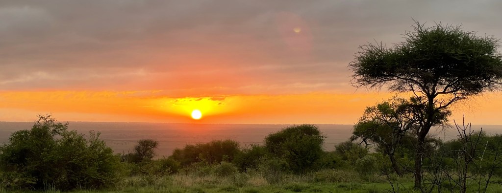After a Kodachrome sunrise, our drive started and ended with giraffes (see below), but we’re leading off with this fine family of elephants captured by Rowan. (Perhaps they’re on their own expedition somewhere?)