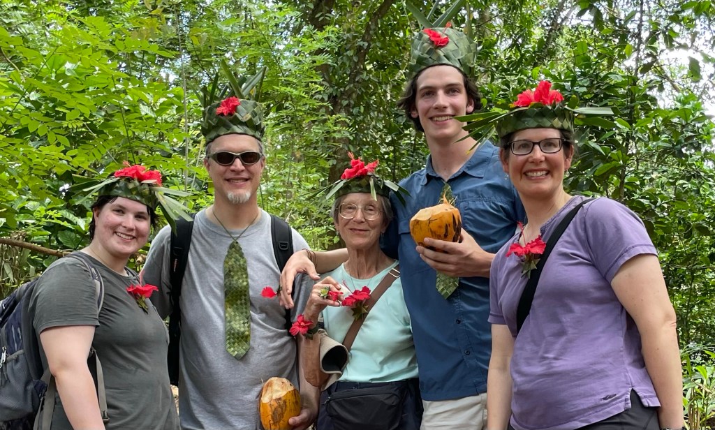 The isles of Zanzibar were known to early European traders as the Spice Islands and to this day they still grow many of the spices we find in our kitchens. So it seemed fitting to start our day with a tour of a spice plantation. We saw many different plants, both spices and fruit, including the so-called “king” and “queen” of spices: clove and cinnamon. The law actually prohibits private export of cloves so if you’re a farmer wanting to do business abroad you have to sell your crop to the government. The guides were knowledgeable about spices and their medicinal uses, and as we walked they somehow fashioned us a whole wardrobe out of palm leaves and hibiscus flowers!
