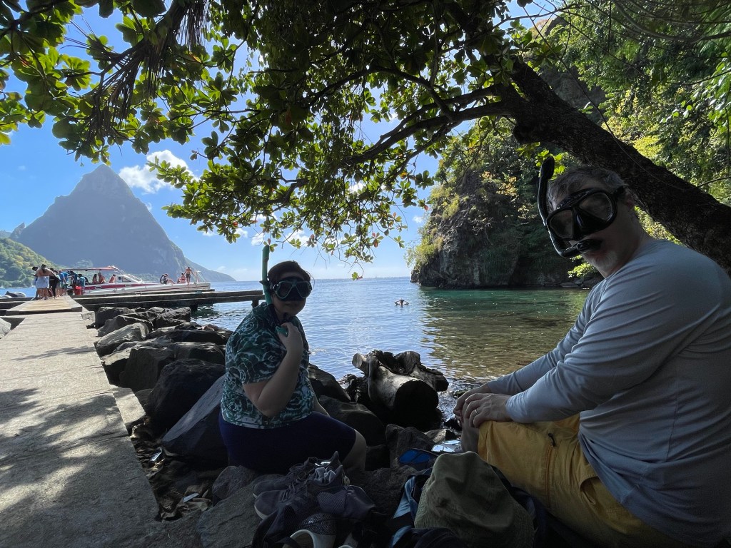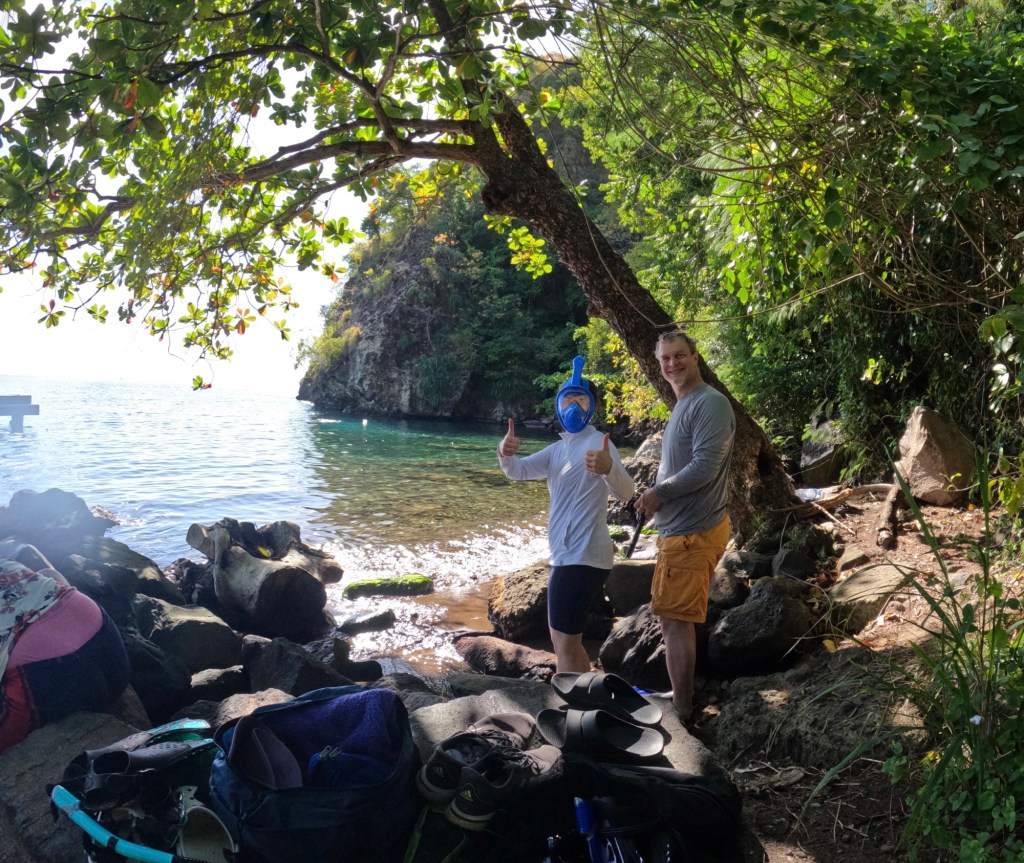 You may noticed the steepness of the seacoast here. In fact, they continue plunging downwards under the water as well, except that they are covered with coral and teeming with colorful fish. This means that even the unassuming cove at the end of the Soufrière town beach offers excellent snorkeling, and our main plan for the afternoon was to test out all the new snorkeling gear we brought along. Susannah was especially eager (?) to use her full-face snorkeling mask, given her intense love (ha!) of water sports. And guess what? It worked!!