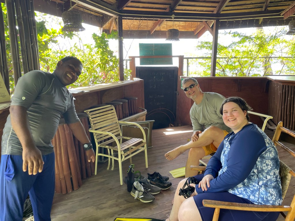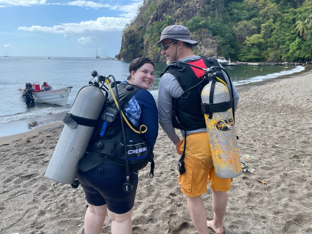 At noon, Rowan and Nick had an appointment on the Soufrière beach. Rowan has always been interested in scuba diving and this was their chance to try it out. Scuba instructor Chester was efficient and professional, and knew just how to set us at ease. After a short lesson on safety, equipment, and critical hand signals, he had us in the water – literally immersion training! Of course, we didn’t go very deep (maybe 30 feet or so), but we cruised underwater along the reef for 45 minutes and saw lots of interesting aquatic life. There was a long-legged crab hiding under a rock, a hard-to-spot octopus prying open a shell, and a sea eel that Rowan got to hold after Chester picked it up (we wouldn’t have dared on our own). No pictures from the dive itself but we have them in our mind’s eye.