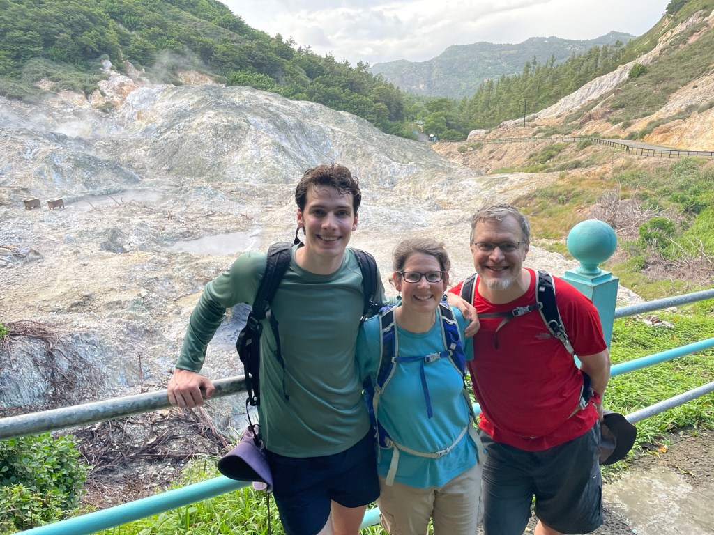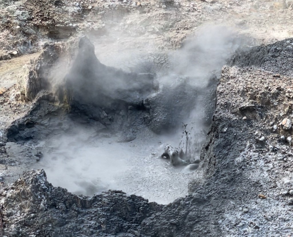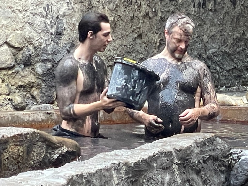 A small stream flows through the volcanic area, picking up minerals, sediment, and heat as it goes. A bit downstream, people have built a series of rock pools to capture the flow and allow bathing. Many consider the volcanic mud to offer health benefits and even anti-aging properties. We’re not sure how seriously to take this, but Nick and Ben couldn’t pass up the chance to lather themselves with hot mud just in case. The pool itself is filled with a sort of slurry that can be collected in the buckets provided. Susannah didn’t get wet, but had a great time taking photos as the action unfolded. The mud bathing seems popular with everyone – local residents outnumbered the tourists when we were there.