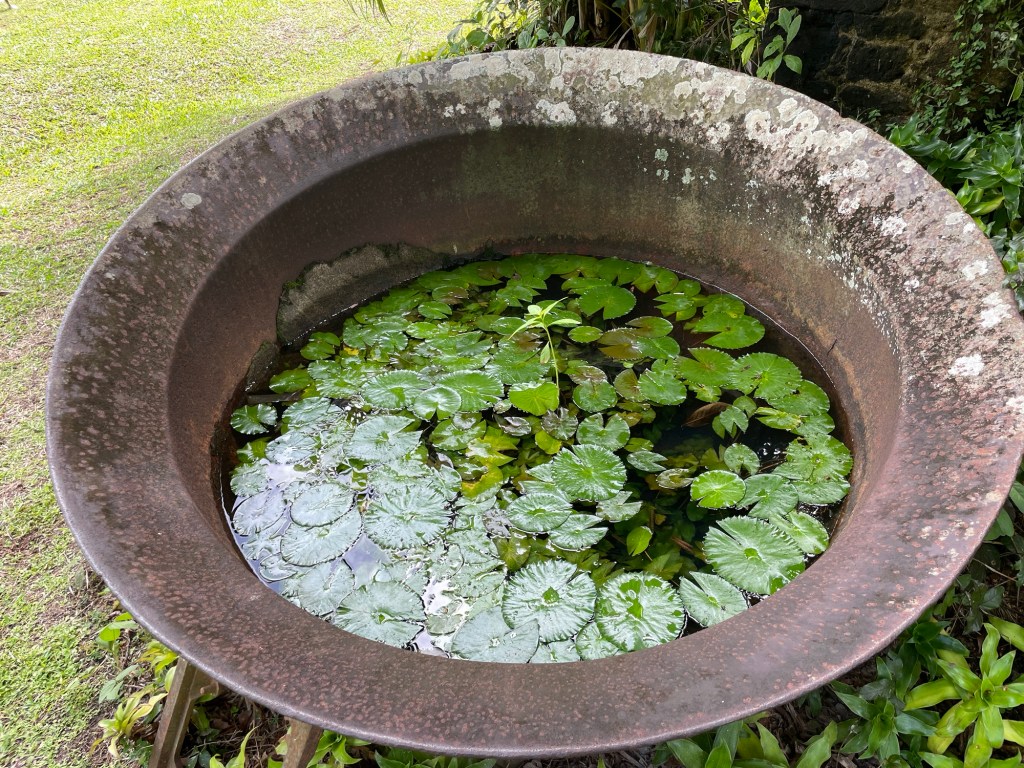 The process of refining sugar cane involved boiling juice in large metal vats of progressively smaller size as the concentration increased. You can still see these around the property (and elsewhere in St Lucia) often repurposed as planters or garden features.
