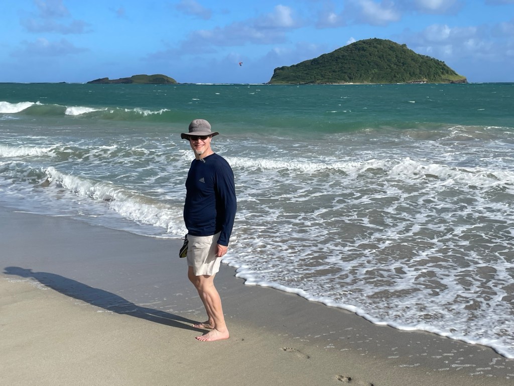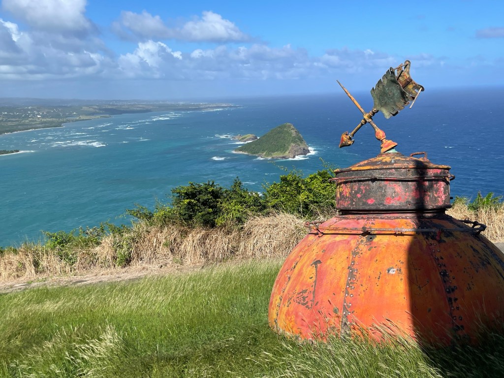 Continuing south to the furthest tip of the island, we climbed the headland at Cape Moule-a-Chique and explored around its now-defunct lighthouse. Interestingly, all the tourist photos show the lighthouse as you might expect it to look, but we found the reality to be somewhat different with the light gone and its iron dome resting on the grass below. Victim of corrosion and metal fatigue? We don’t know. That didn’t stop us from enjoying the sweeping views to the north, including the Maria Islands nature reserve. Rowan has especially hoped to visit these islands because they house the nearly extinct St Lucian racer (snake) and whiptail lizard that live nowhere else, but alas, the reserve is no longer open to the public (presumably for the animals’ protection).
