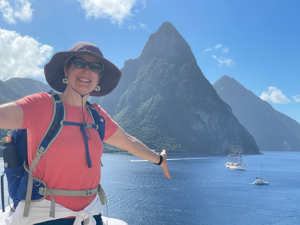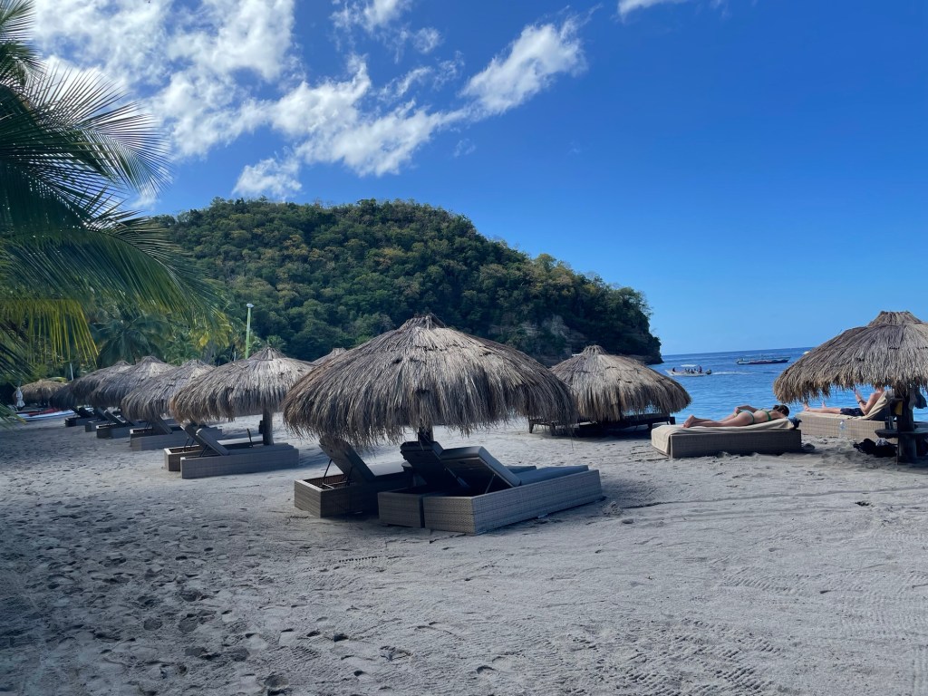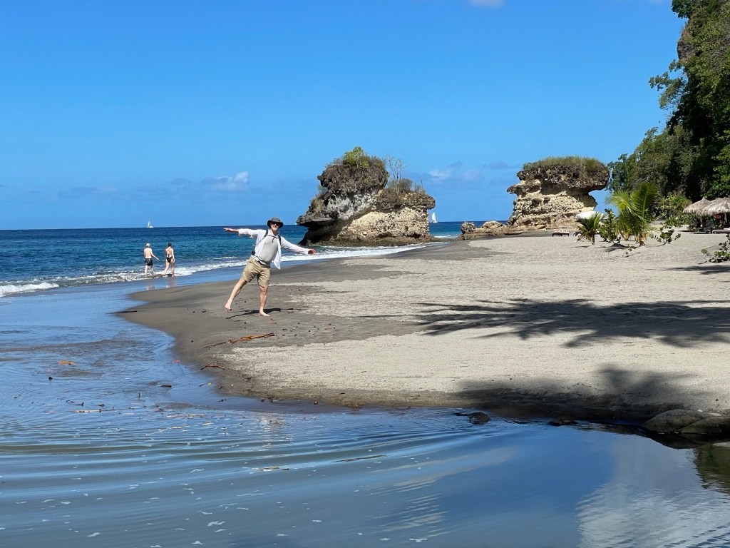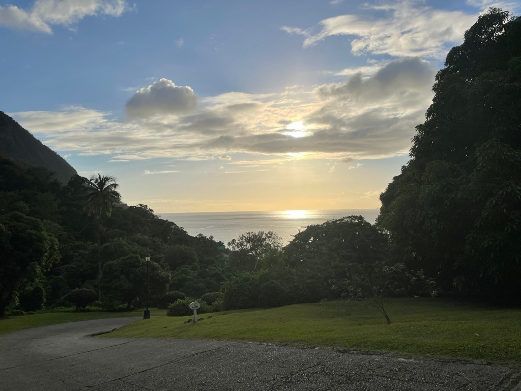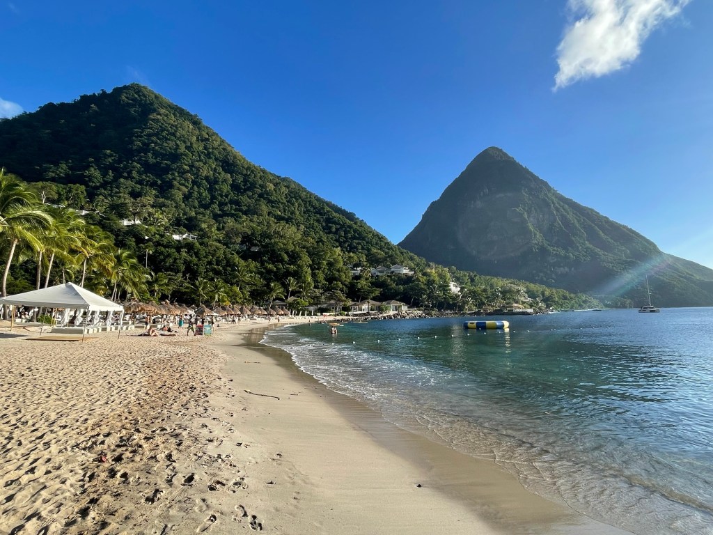 The original plan had been to take a restful morning given yesterday’s hike, but Susannah got to talking with some fellow guests who had walked to local beaches at both Anse Chastenet and Anse Mamin, so of course we had to try it too! Nick and Susannah were both pleased to discover that the potholed road to Anse Chastenet was much easier on foot than by car, albeit also sweatier in the morning heat. As an added bonus, it granted us our first opportunity to capture both Pitons in the same frame (see above).