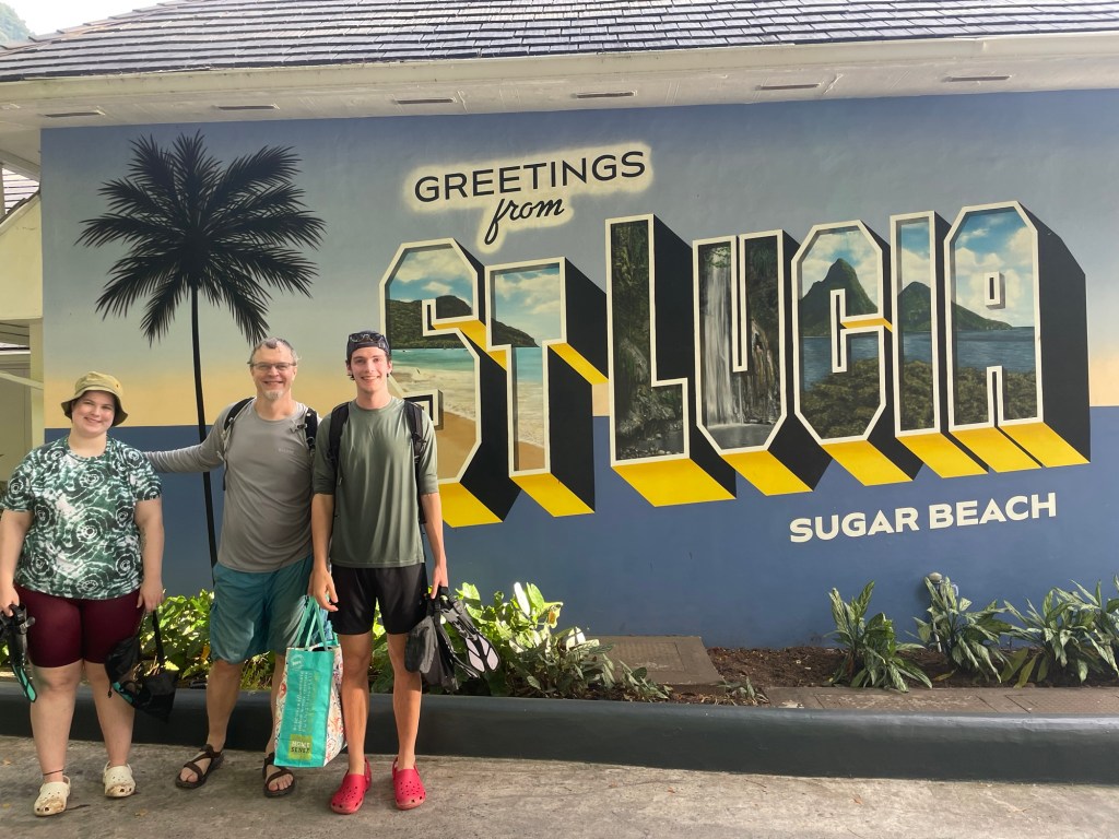 Sugar Beach, situated between the two Pitons, was the only local cove that we hadn’t yet explored. It is said to have good snorkeling, so in the afternoon, off we went to check it out, with snorkels and fins and kids in tow. It, too, is dominated by a large and expensive resort. Like the others it allows beach access, but the parking lot provided for visitors is way up the hill and requires a long walk down the busy access road to reach the water. In the end, it was worth it because snorkeling was really good and we found a shady spot by the water to sit with our stuff.