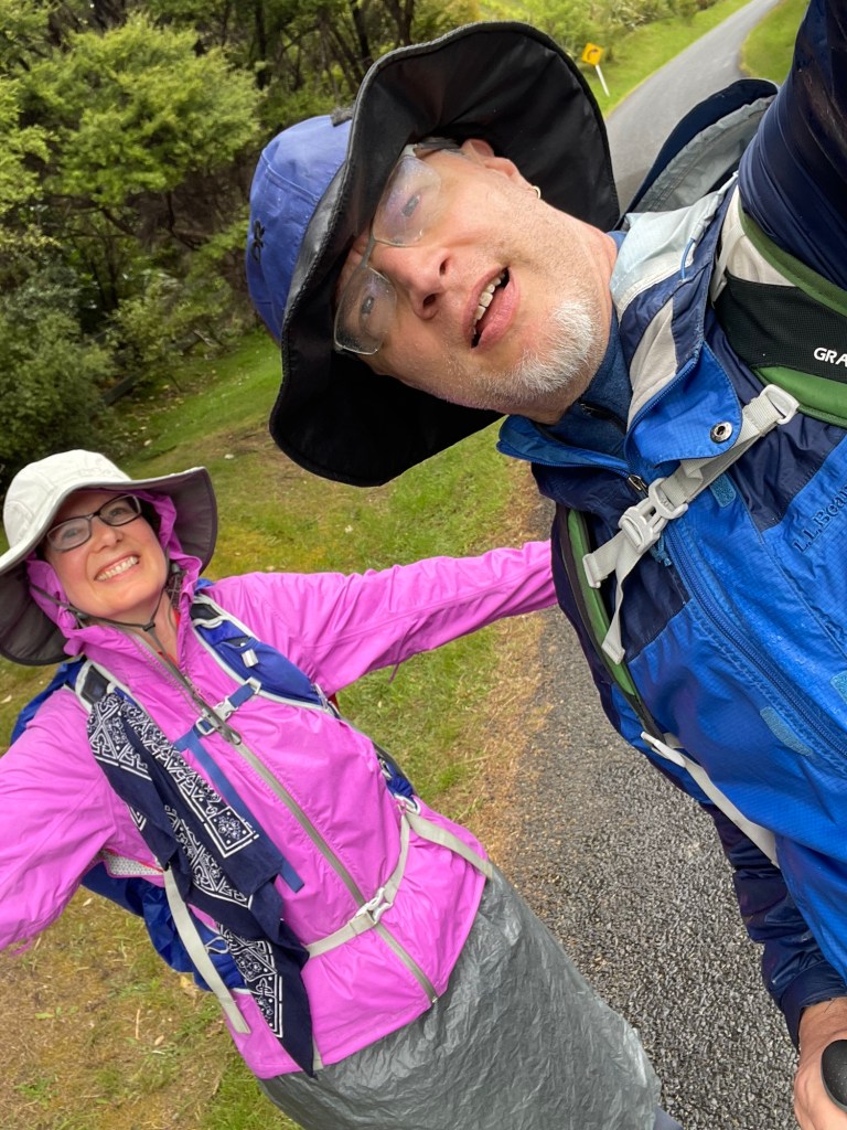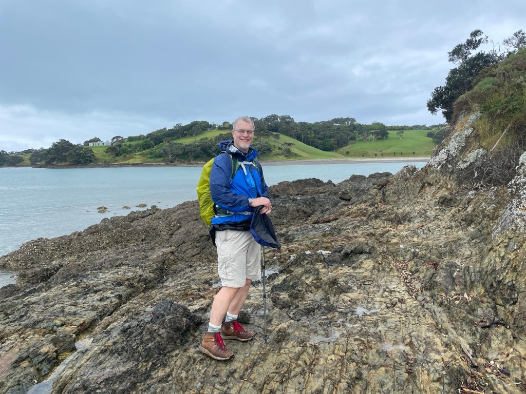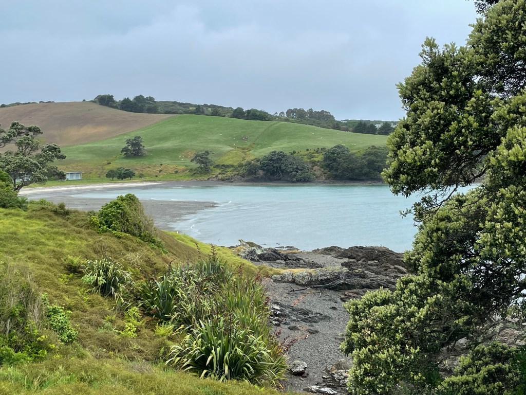 For our third day of hiking on Waiheke the weather was not as promising as it had been on the first two. Indeed shortly after we set off in the morning, a fine yet driving rain blew in from the northwest. Fortunately we were well supplied with pack covers, jackets, and rain kilts so the weather didn’t bother us much. We had light rains on and off throughout the day, so kept having to pause and swap in and out of rain gear.