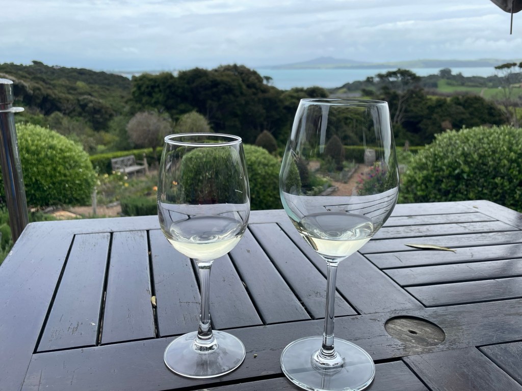 As planned, we ended our hike for the day close to the Mudbrick winery. They offered a tasting of six local Waiheke wines, which we were free to enjoy on their outdoor terrace (the rain had fortunately stopped by this point). Our table was visited by a rather bold duck who seemed to hope that we would have some food to share. She kindly posed for several pictures even when food was not forthcoming.