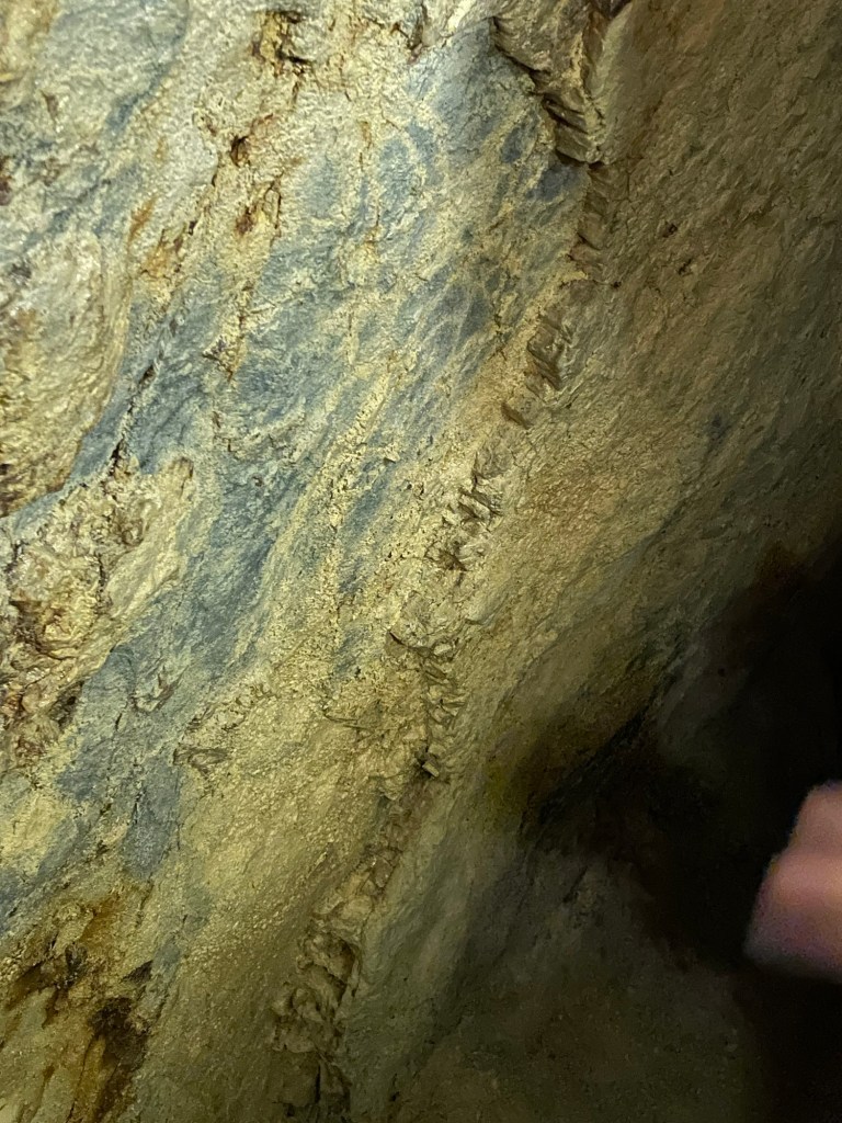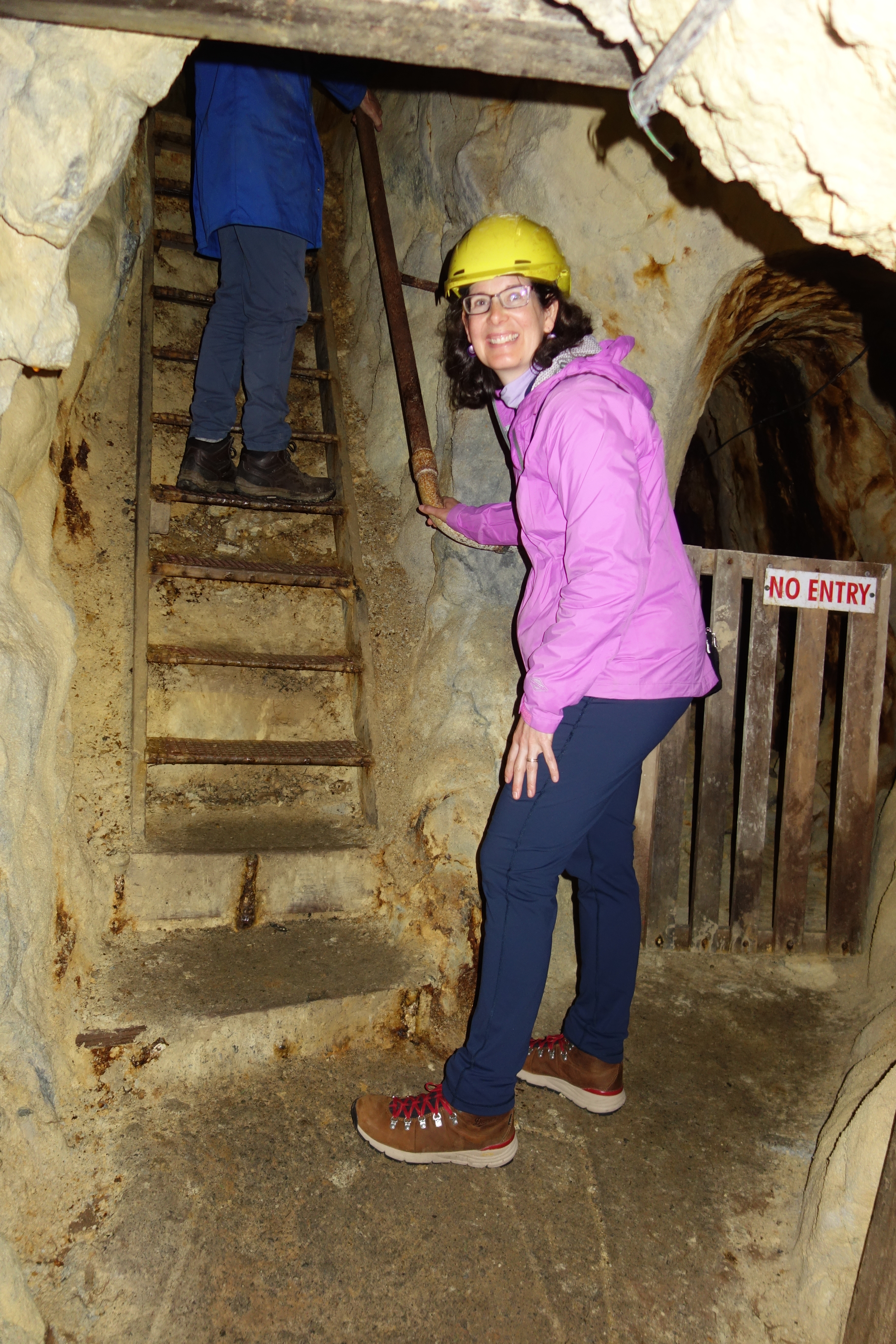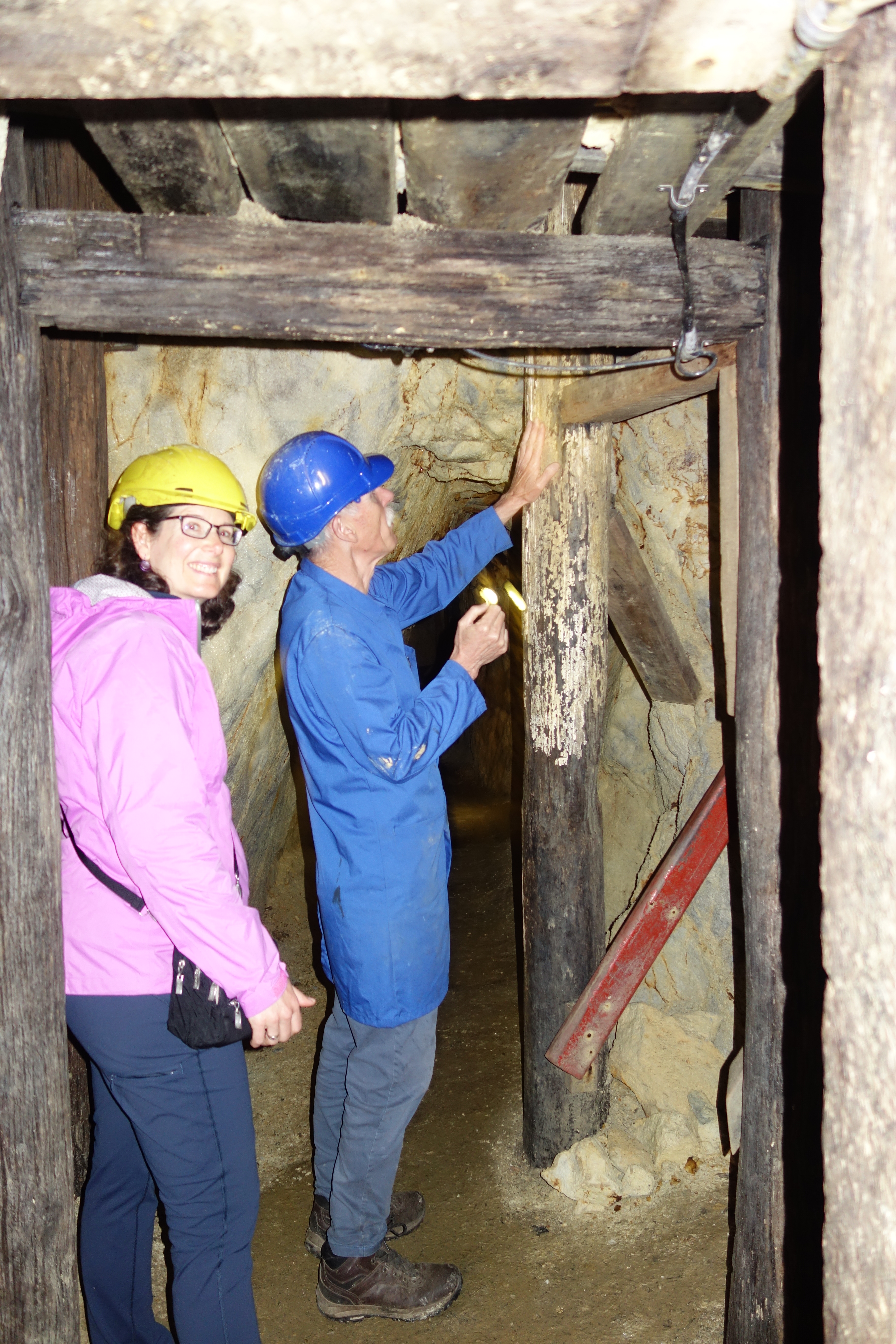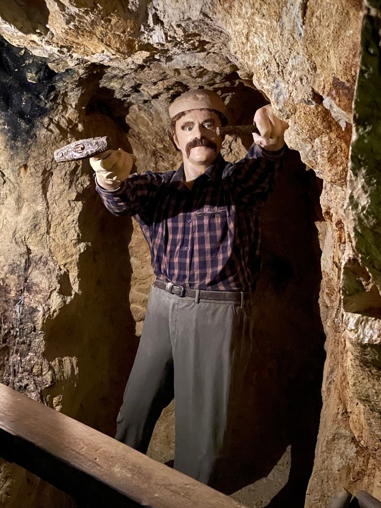 We began inside one of the mine tunnels on the property. It was dug by Cornish miners, which meant that the work was skillful and the ceilings are low. Working as a team of three, they could dig about 3 to 6 feet per day through the volcanic rock, searching for veins of quartz that might contain flakes of gold. The section we visited was a prospecting tunnel, dug on speculation. If the miners didn’t strike gold, they received no compensation for their time and effort.