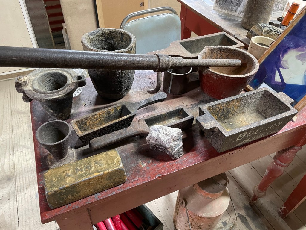 Tools used in refining precious metals. A retort recovers mercury from the heated amalgam. Impurities are removed in a crucible, and the purified metal is formed into an ingot in a bullion mold.